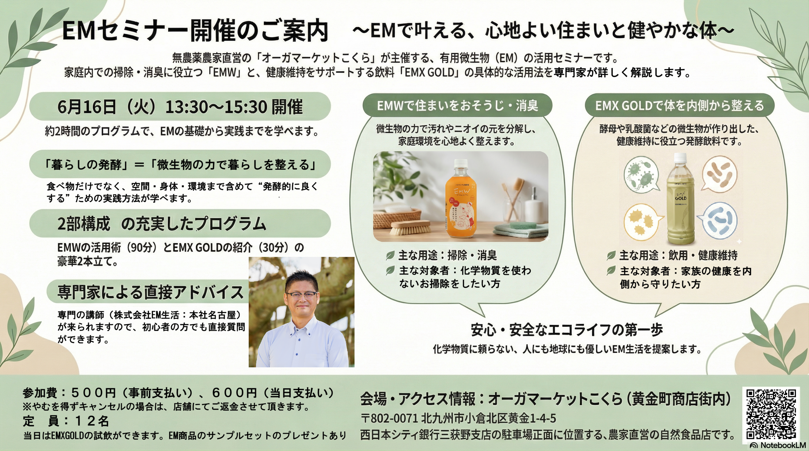 ・イベント案内・・・当店で開催予定のEMセミナー『暮らしの発酵~EMで叶える、心地よい住まいと健やかな体~ 』のご案内です。