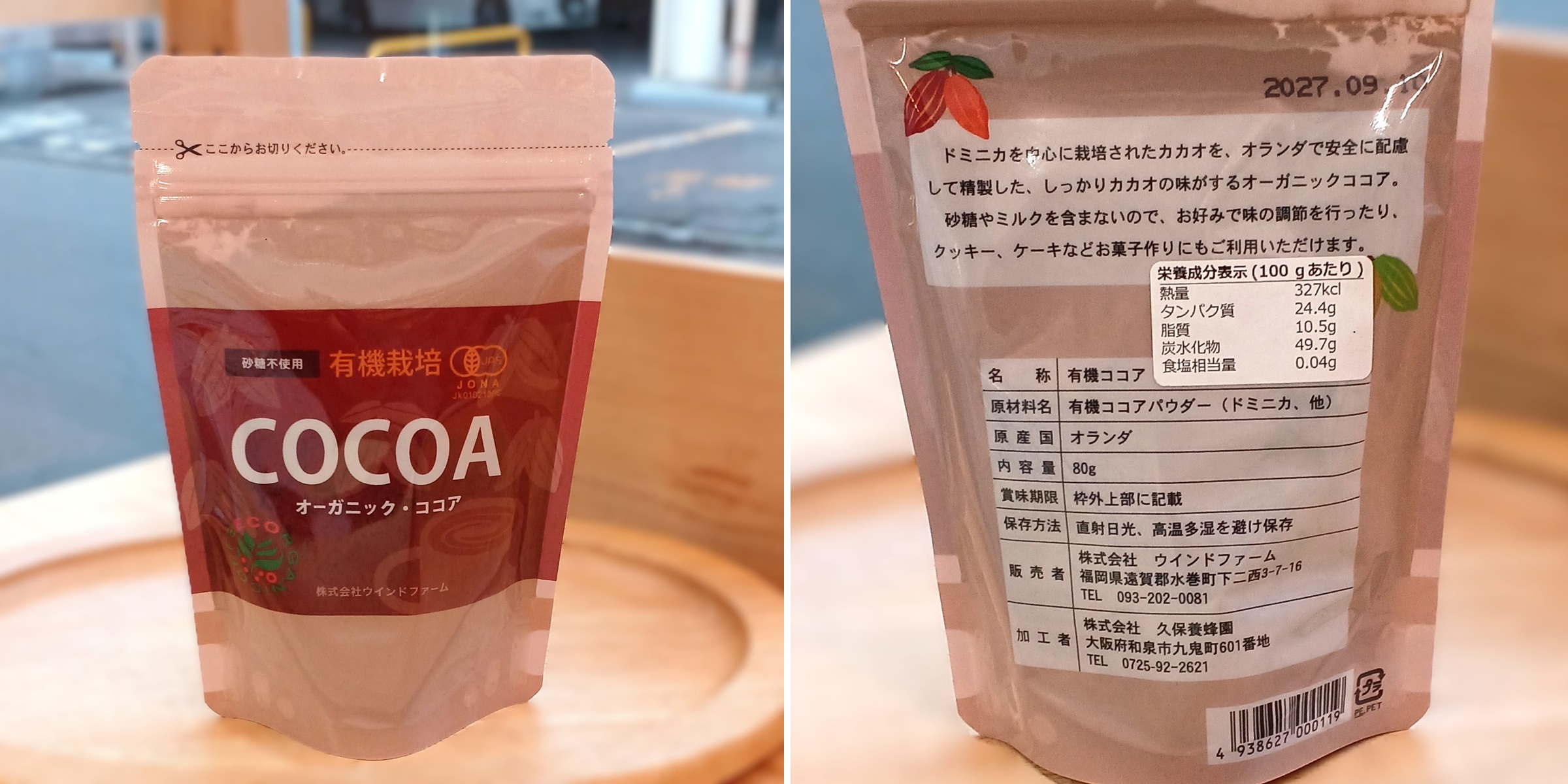 ・新規入荷・・・ウインドファームさんの❝オーガニック・ココア(80g)❞入荷しました 。添加物も砂糖も無添加ですので、お好みで味の調節を行ったり、クッキー、ケーキなどお菓子作りにもご利用いただけます。